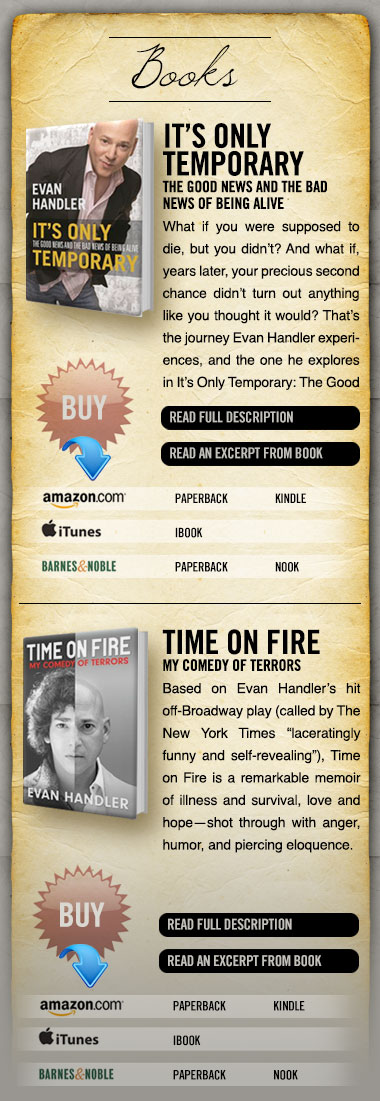 Picking up ten years after his first book, Time on Fire, Handler again uses what the New York Times calls his “laceratingly funny and revealing” storytelling skills to weave twenty-one new tales into a defiantly unconventional memoir. Consistently witty and insightful, Handler’s stories shift effortlessly from the comedic to the profound, musing with equal intensity on the existence of God and his experiences with TV stardom. Then, just when it seems he’s failed to make the most of his astonishing second chance, Handler finds his way to miracles even greater than the ones that saved his life. His memoir describes his journey from darkness to light, from yearning to gratitude, and in so doing succeeds as both a stirring love story and a classic coming-of-age tale. It’s Only Temporary celebrates the transformation of a boy to man—even if it look Handler more than forty years to get there.